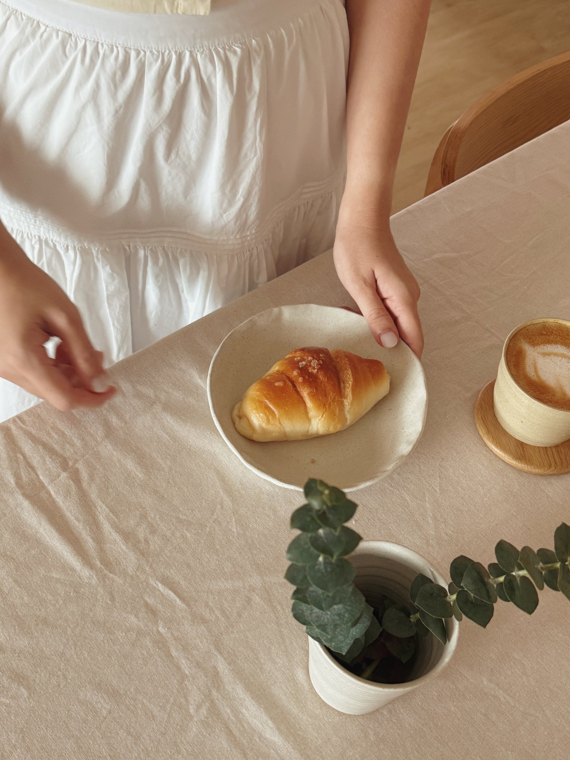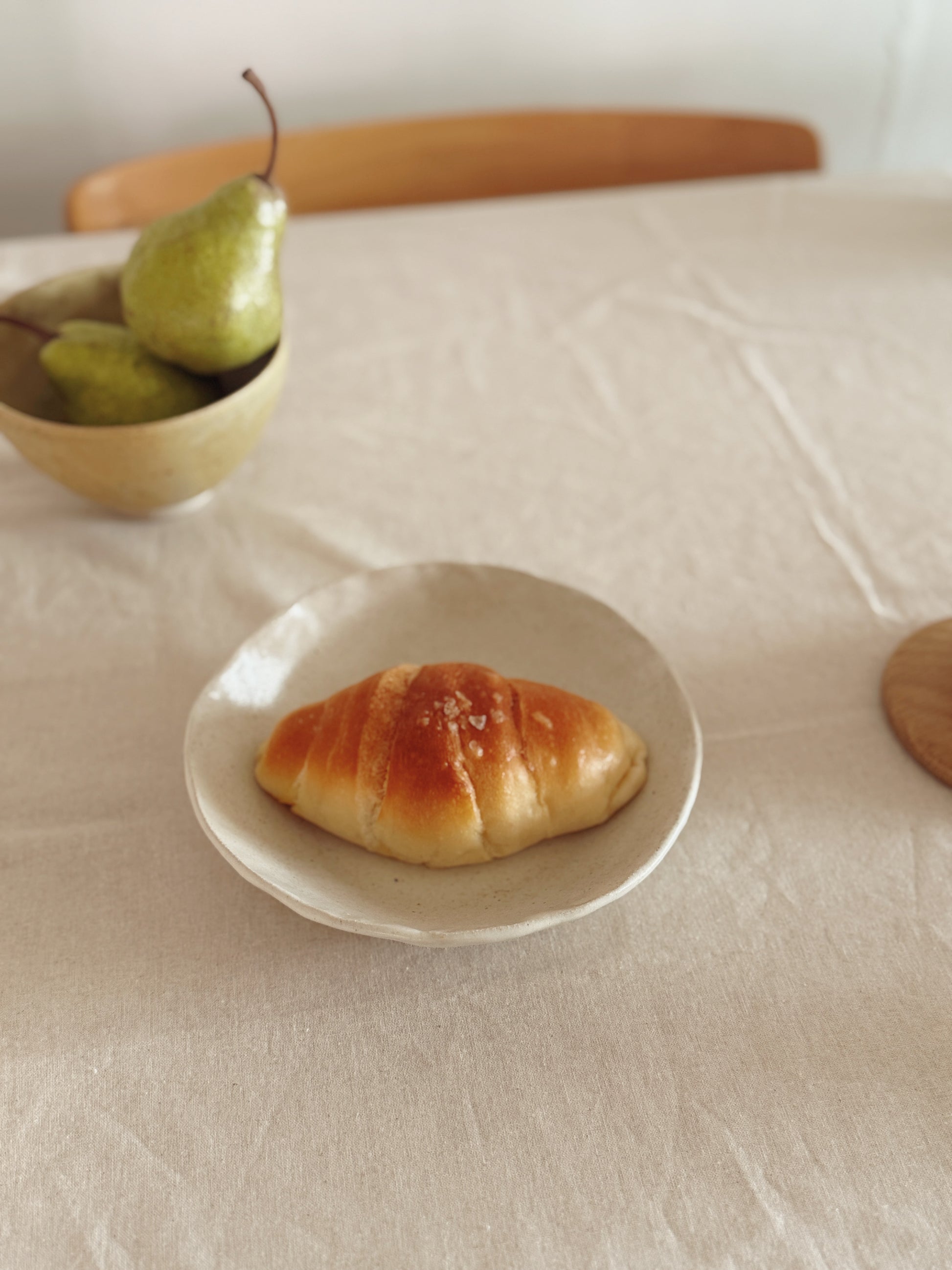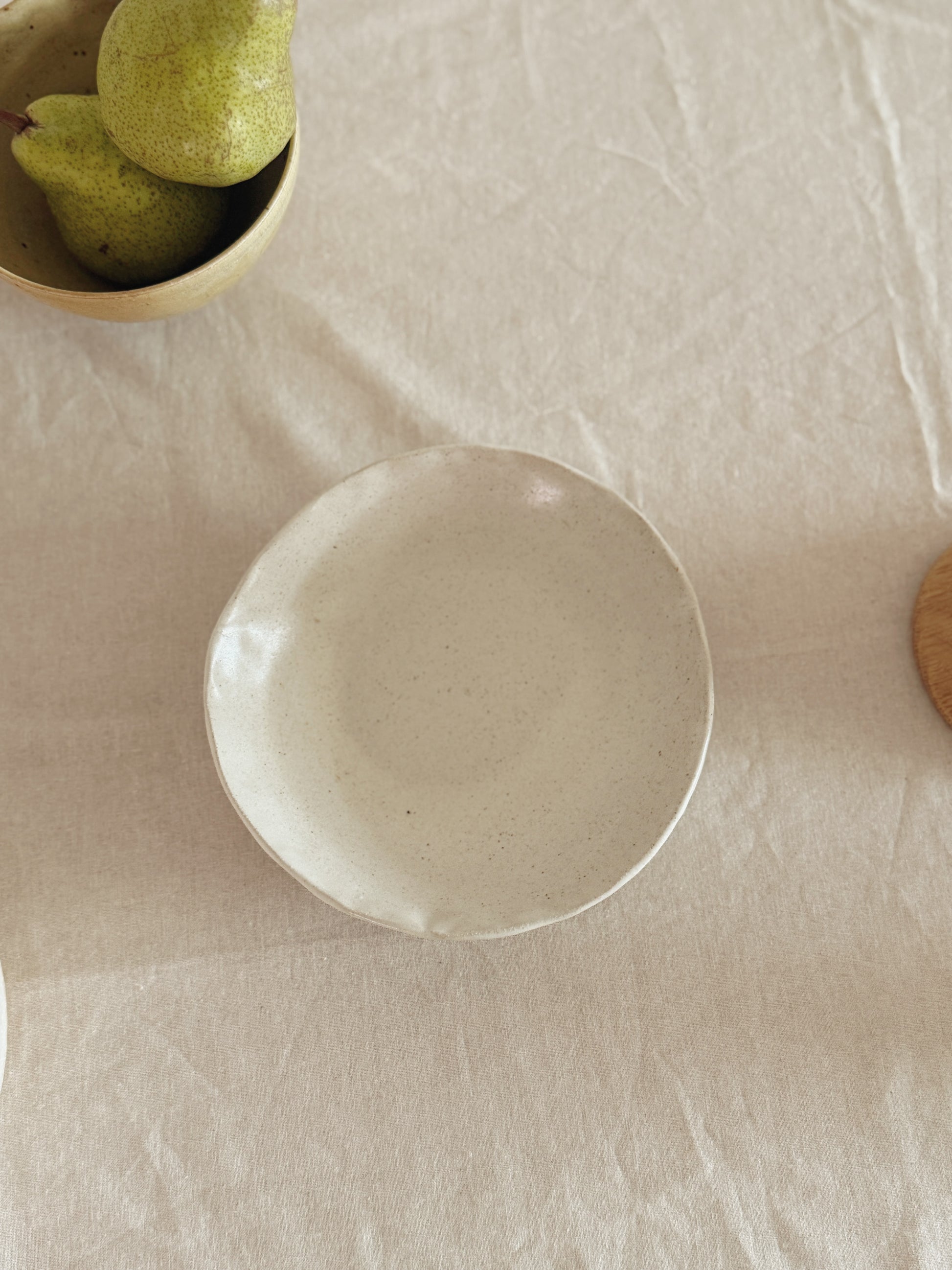 — The Piper Plate has a gentle, organic silhouette with slightly uneven edges, adding to its handmade character. Finished in a light speckled glaze, it feels warm and natural, perfect for breads, pastries, or small bites. Its simplicity lets food take center stage while offering a touch of understated elegance.